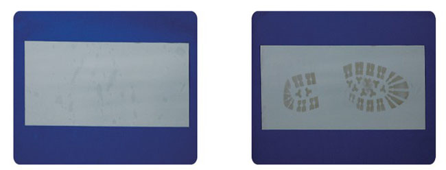 5. 白色明膠片表面白度極高,內(nèi)反射光極強(qiáng)。用其粘取血足跡,用紫外光、紫光照射。足跡強(qiáng)烈吸收入射光,背景強(qiáng)烈反射入射光,可以獲得高反差足跡。