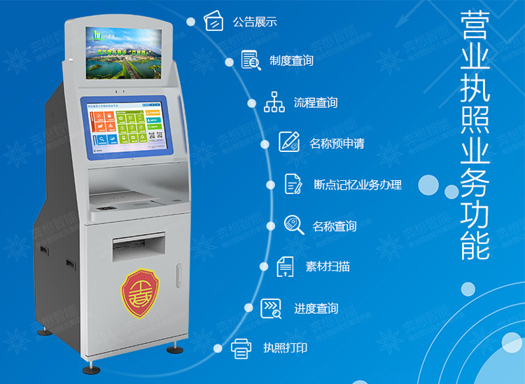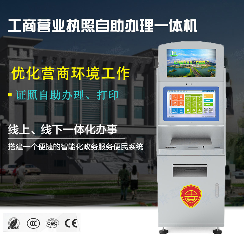 工商營業(yè)執(zhí)照自助申請(qǐng)一體機(jī),整合人工辦理業(yè)務(wù)申請(qǐng)的流程。
