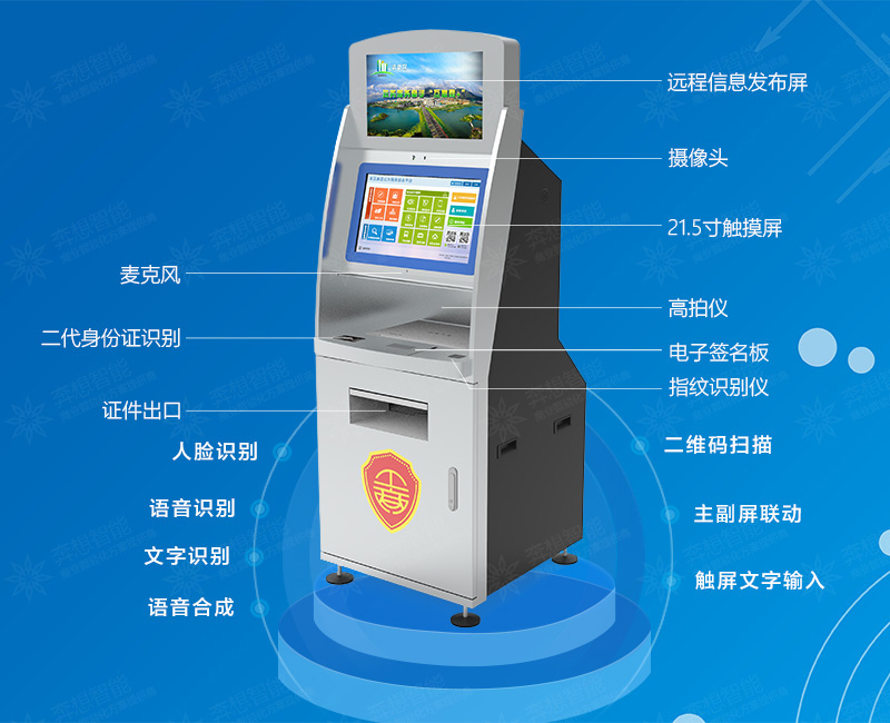 1、燈箱/信息發(fā)布屏/聯(lián)動(dòng)屏;2、攝像頭;3、21.5寸紅外觸摸屏;4、高拍儀;5、指紋識(shí)別模塊;6、身份證讀卡器;7、電子簽名版;8、打印機(jī)(A3/A4);9、麥克風(fēng)。